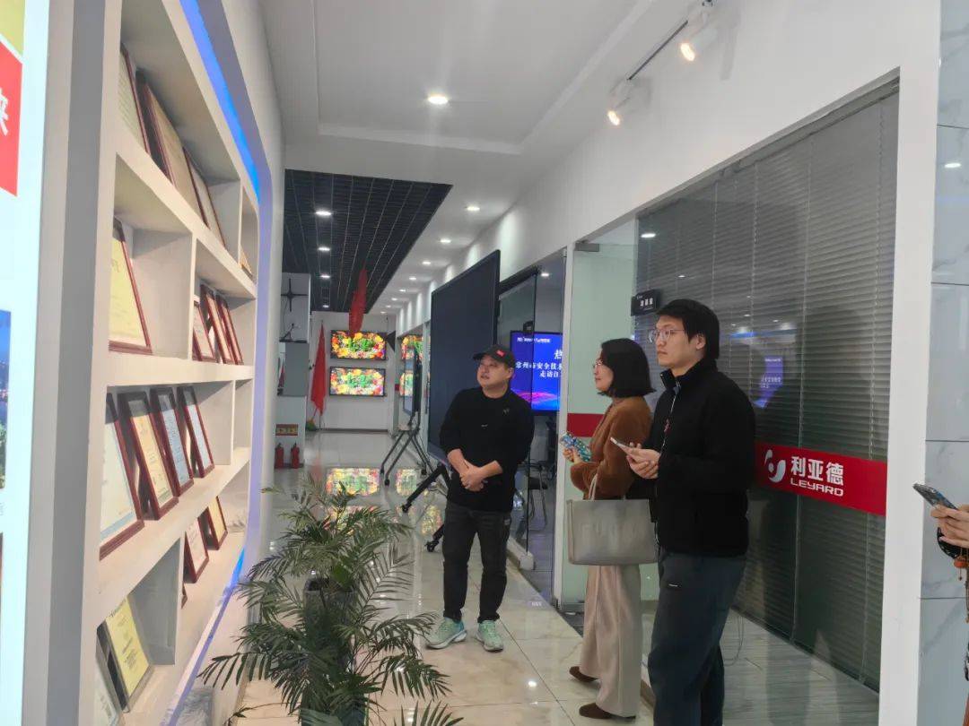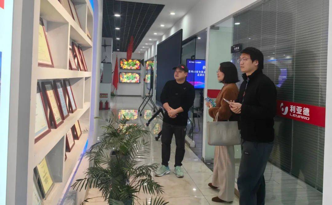 章总陪同到访代表参观了利亚德(江苏·常州)体验中心,介绍了智能化产品及资质证书,如LED/LCD会议一体机、球形屏、地砖互动屏、3D屏等,包含多类不同的应用场景。