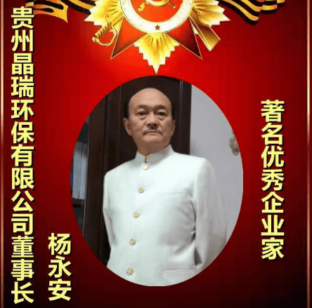 杨永安 贵州晶瑞环保清洁有限公司董事长、中国影视歌曲大赛组委会副秘书长、中国茶文化研究院贵州分院院长、贵州省黔南州农业产业协会名誉会长,贵州省布依学会常务理事长。先后荣获得“生态黔南布依标杆”、“小康寨建设帮扶模范”、十佳光彩事业贡献奖”、“黔南州十大优秀企业家”等荣誉称号。