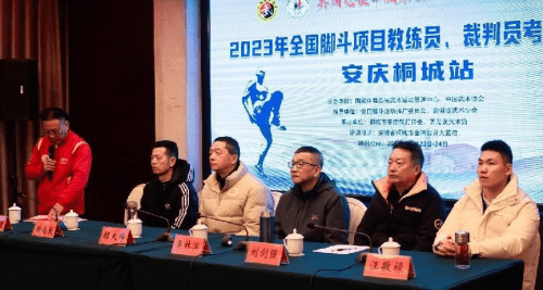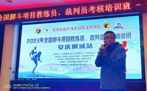 2023年12月22日--24日,“2023年全国脚斗项目教练员、裁判员考核培训班(安徽桐城站)”在桐城金瑞古井大酒店顺利开班。本次培训由国家体育总局武术管理中心、中国武术协会主办,全国脚斗运动推广委员会、安徽省武术协会为指导单位,桐城市拳击散打协会、齐龙友武术馆承办。23日上午,全国脚斗运动推广委员会执行秘书长吴林滨、培训部主任汪敬禄、桐城市人大常委,文化旅游体育局一级主任科员程大伟,安庆市武术协会主席刘剑强、常务副主席徐尚艮以及来自安徽、重庆、河南、北京、江西、江苏、新疆等地的30余名高校体育教师、体育从业者、脚斗运动爱好者参加了开班仪式。桐城市武术协会常务副会长、桐城市拳击散打协会会长齐龙友主持开班仪式,
