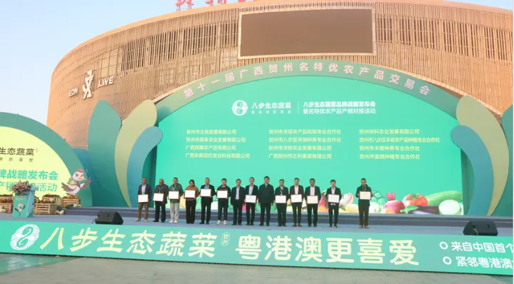 贺州市八步区人民政府副区长陈宏乾,八步区农业农村局局长周声茂为首批获得八步生态蔬菜区域品牌授权的12家企业颁发品牌授权使用证书。