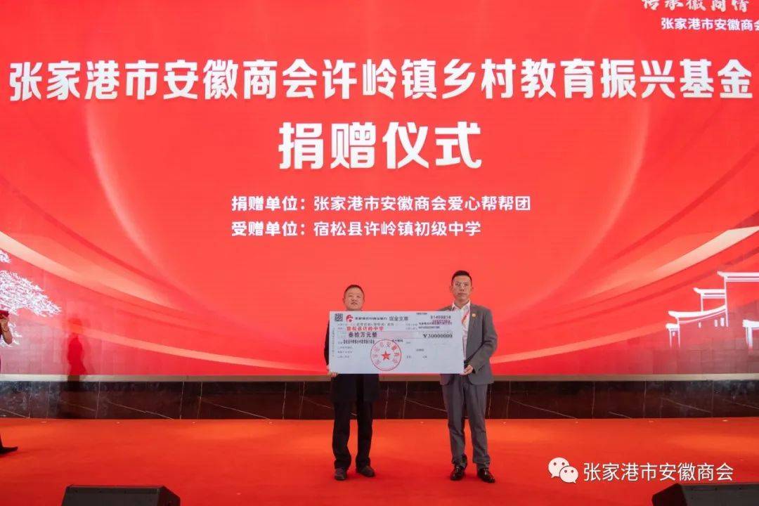 常务副会长兼爱心帮帮团副团长徐春玉代表商会捐赠30万元,与宿松县许岭中学举行了“张家港市安徽商会许岭镇乡村教育振兴基金”捐赠仪式。