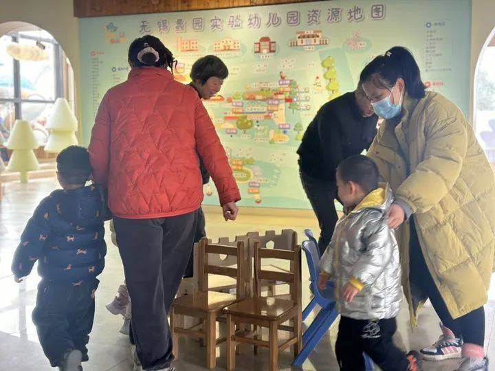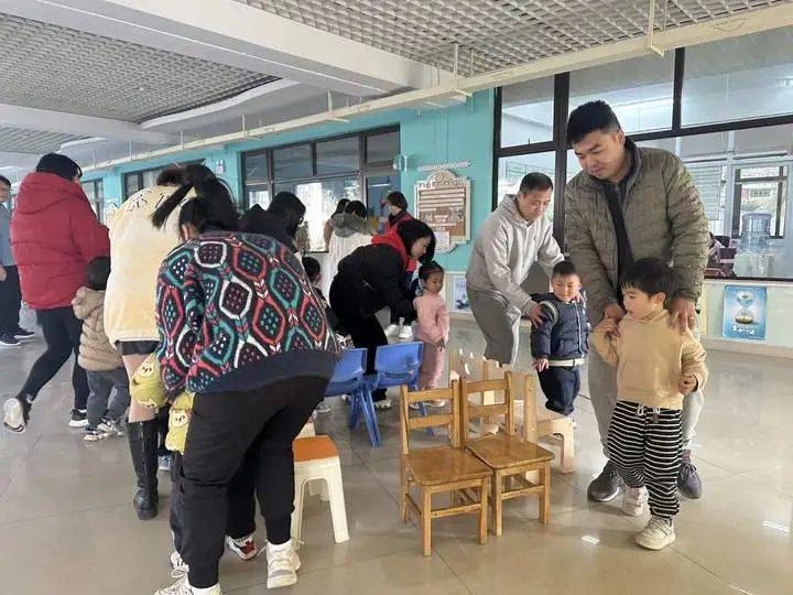 音乐开始,大朋友和小朋友围着椅子转圈,音乐一停!嘿,我抢到椅子咯!