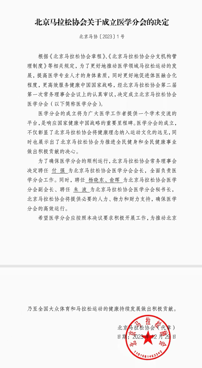 在“健康中国”战略的深入实施背景下,北京马拉松协会医学分会于2023年12月31日在北京大学第三医院(北医三院)正式成立。这一具有里程碑意义的成立会,标志着马拉松运动与健康医学的紧密结合迈出了坚实的一步。会上宣布聘任,国家卫生健康委卫生发展研究中心研究员付强任北京马拉松协会医学分会会长,《当代医学》杂志社副社长朱波任秘书长。