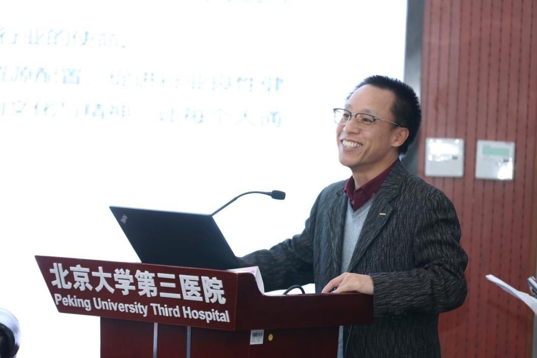 北京大学第三医院党委书记金昌晓致辞,他表示,北医三院将全力支持北京马拉松协会医学分会的发展,加强与医学分会的紧密配合,充分发挥医院在综合医学保障,特别是运动医学、急救医学等专业领域的优势,促进体医融合理念创新、实践创新和科技创新,并期待未来在马拉松运动医学领域取得更多突破性成果。