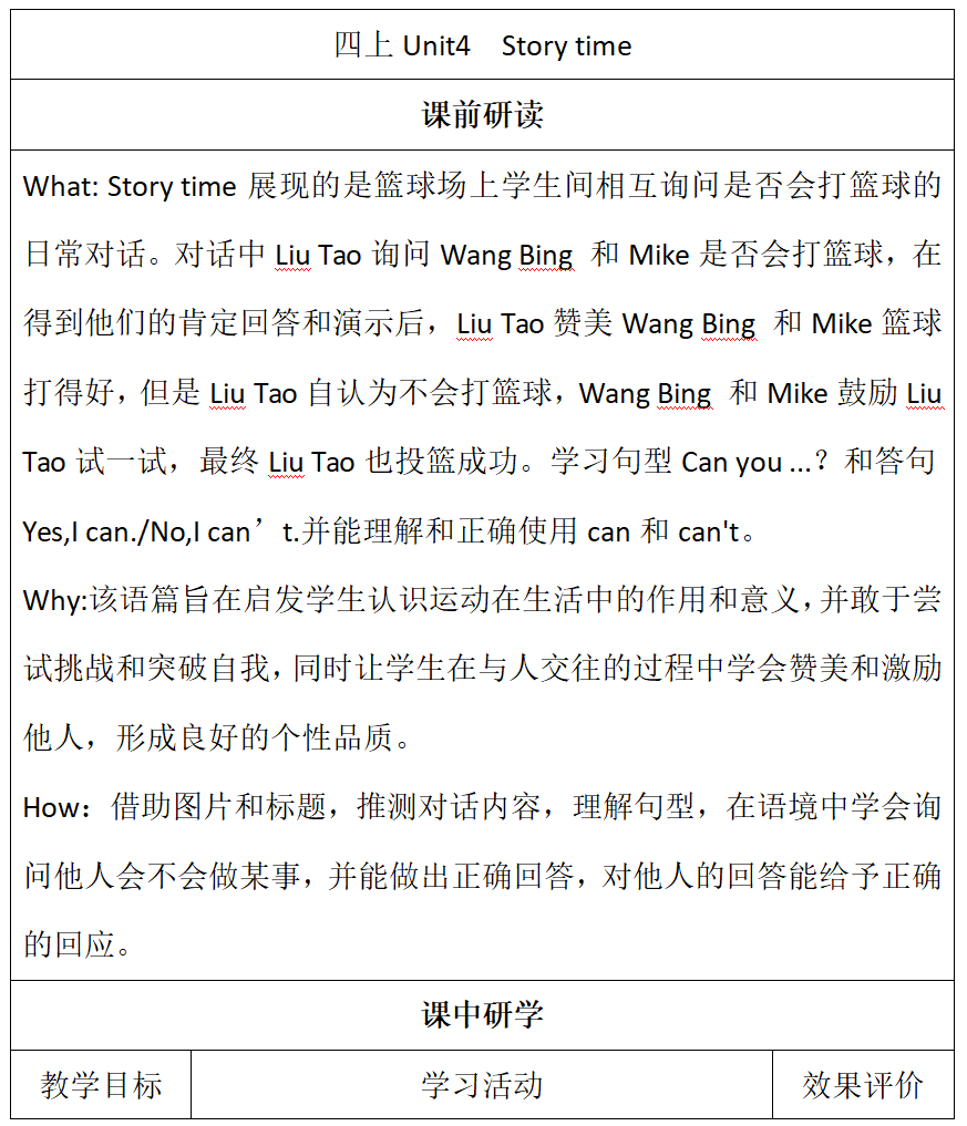 译林英语四上Unit 4 I can play basketball,本单元涉及“人与自我”和“人与社会”主题范畴下的文学艺术与体育,运动与健康以及“人与自我”中的“个人能力与品德素养”“人际交往与自我认知”等子主题。李老师执教的第一课时Story time中,教学内容是篮球场上学生间相互询问是否会打篮球的日常对话。本课目标是学生能够在主题语境中感知句型“Can you ...?”和答句“Yes,I can./No,I can’t.”,并能理解和正确使用“can”和“can't”,启发学生认识运动的意义,敢于尝试挑战和突破自我。
