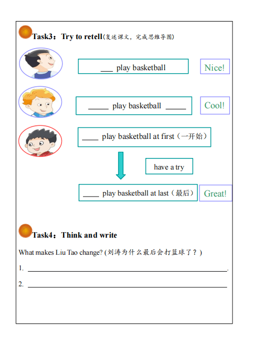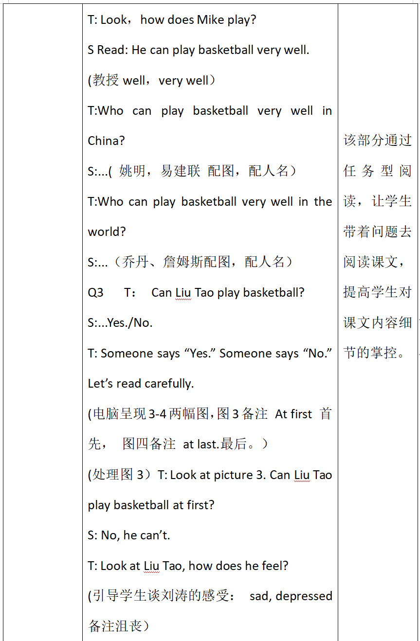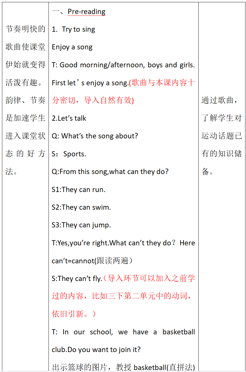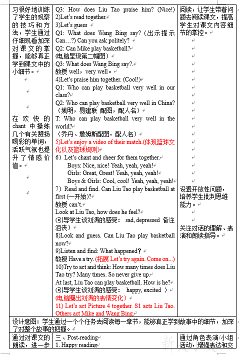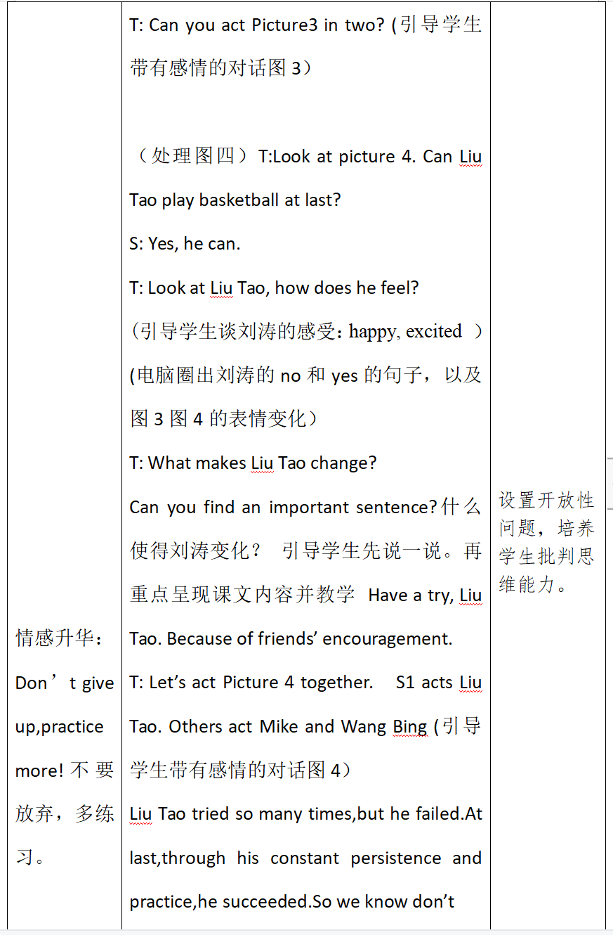 “can”是本堂课的一个关键词,也是本节课的关键目标之一。本堂课建议从该词入手,从“不能”再到“能”进行一个转变的过程,因而落实本课的教学任务。同时在分析课文的过程中,可以拿出篮球实物让学生亲身体验,发现成功并不是一蹴而就的,而是不断尝试,永不放弃地练习造就的。在欢快的chant环节,让学生感悟到同伴之间的鼓励的重要性。各个环节的层层铺垫去引导学生自发地总结出刘涛成功的主客观因素,也感悟到体育拼搏的文化与永不放弃的精神。