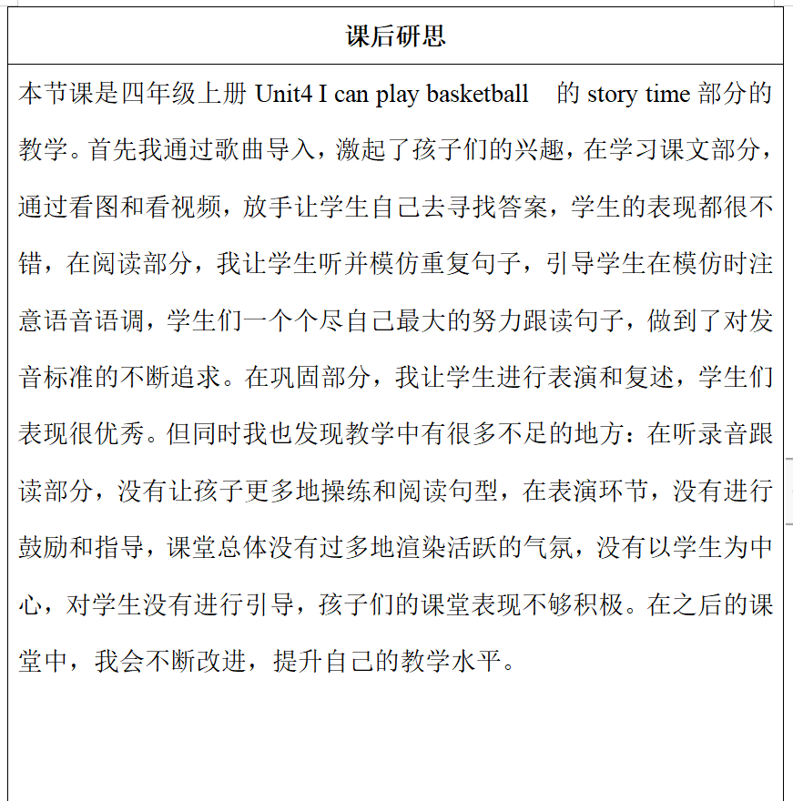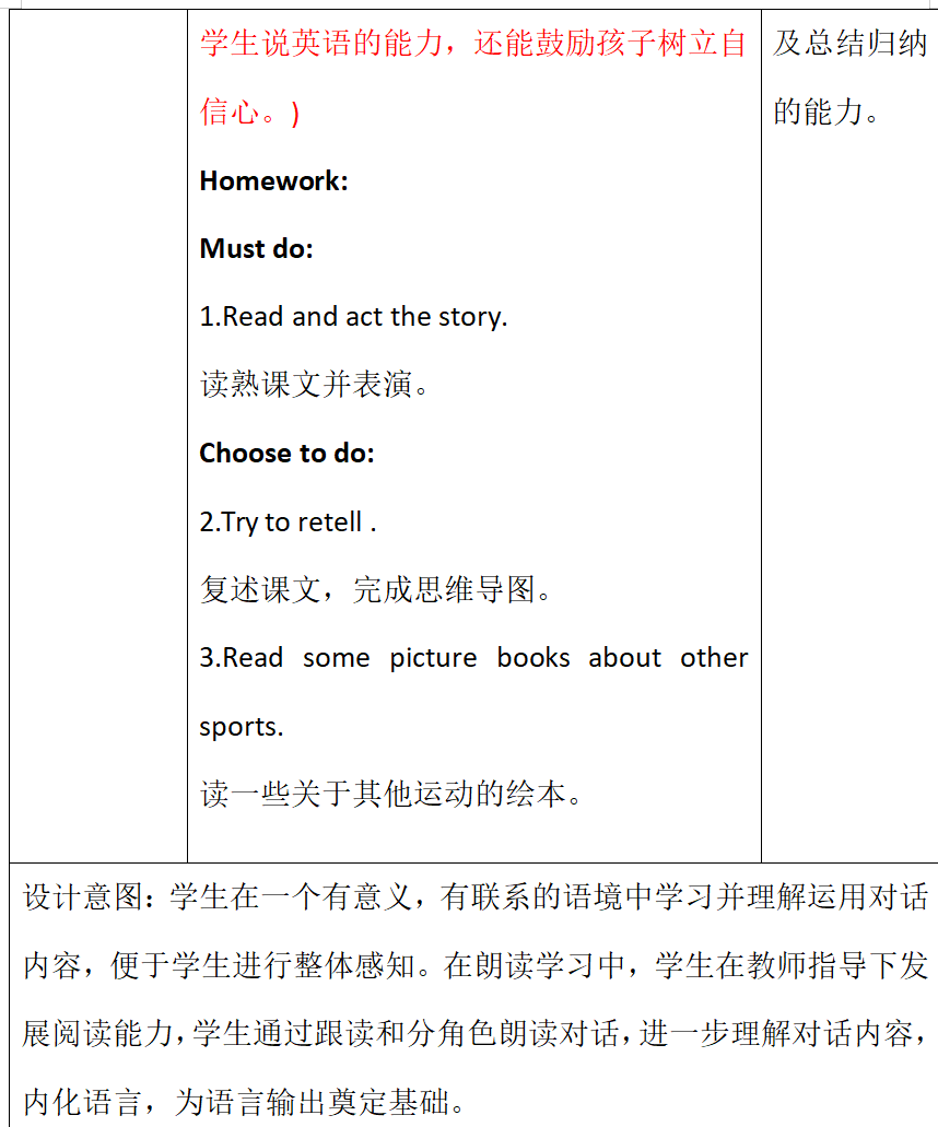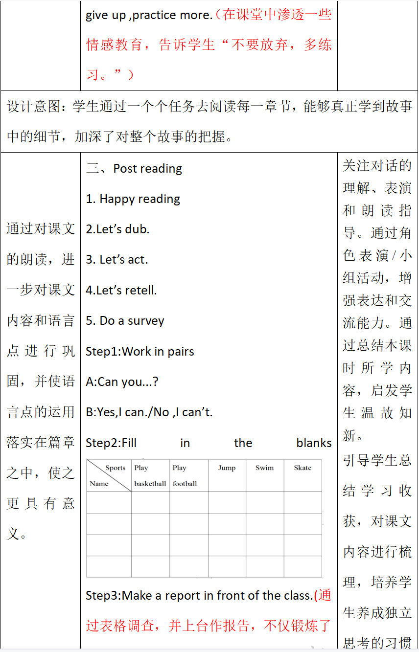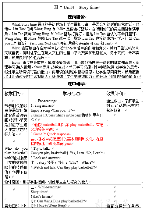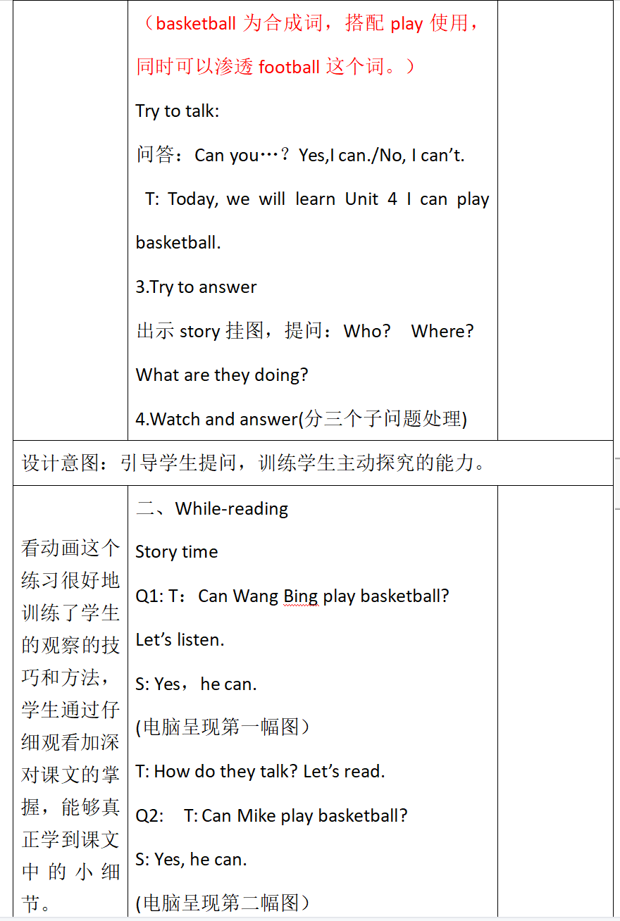 “can”是本堂课的一个关键词,也是本节课的关键目标之一。本堂课建议从该词入手,从“不能”再到“能”进行一个转变的过程,因而落实本课的教学任务。同时在分析课文的过程中,可以拿出篮球实物让学生亲身体验,发现成功并不是一蹴而就的,而是不断尝试,永不放弃地练习造就的。在欢快的chant环节,让学生感悟到同伴之间的鼓励的重要性。各个环节的层层铺垫去引导学生自发地总结出刘涛成功的主客观因素,也感悟到体育拼搏的文化与永不放弃的精神。