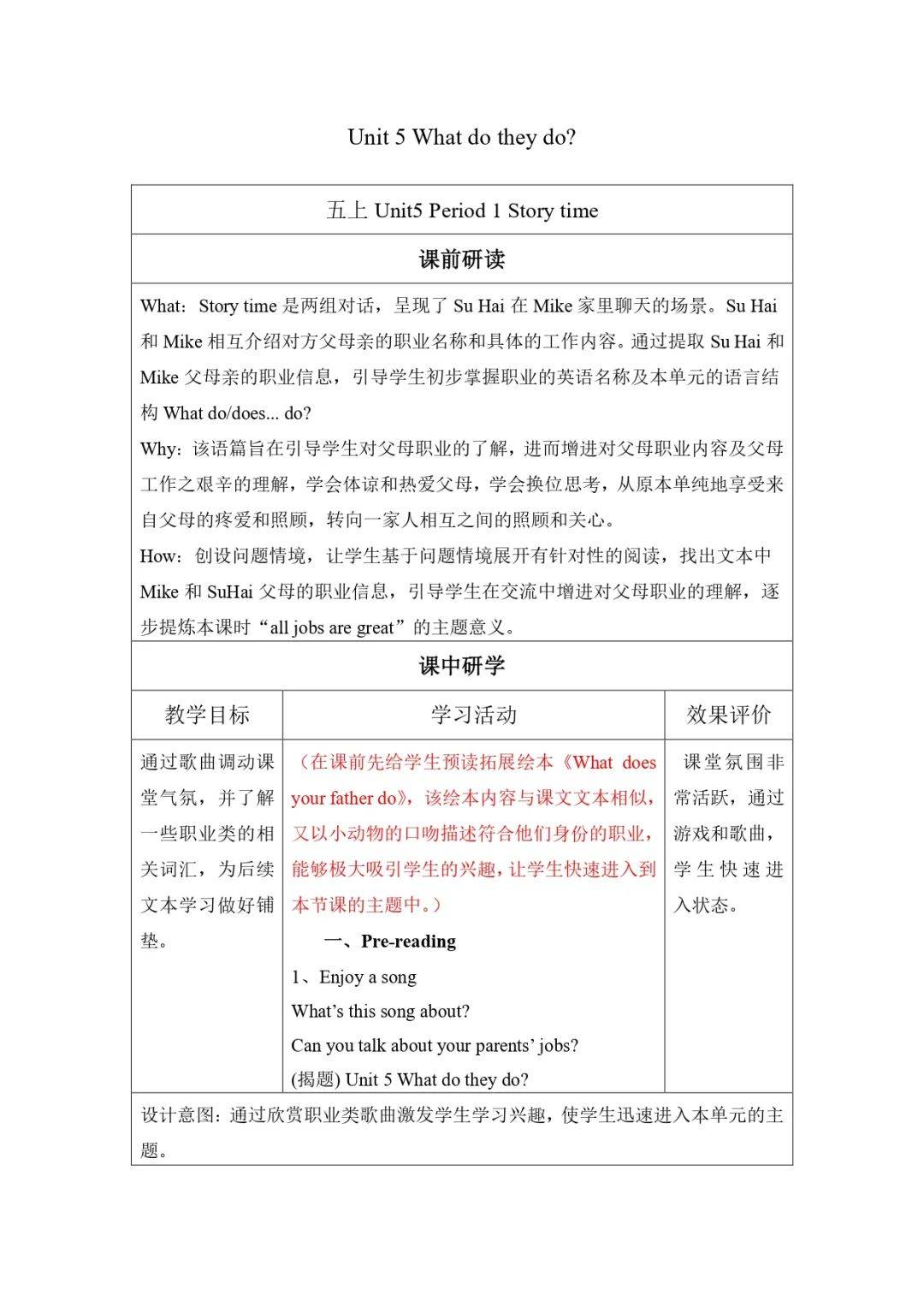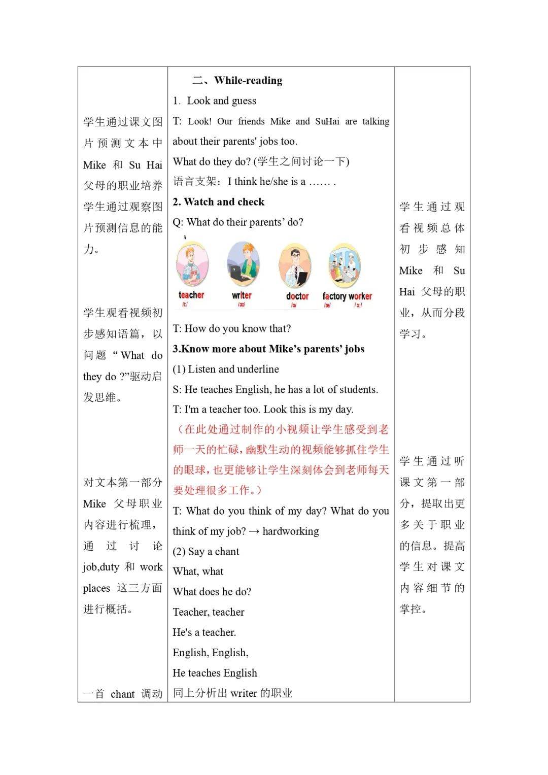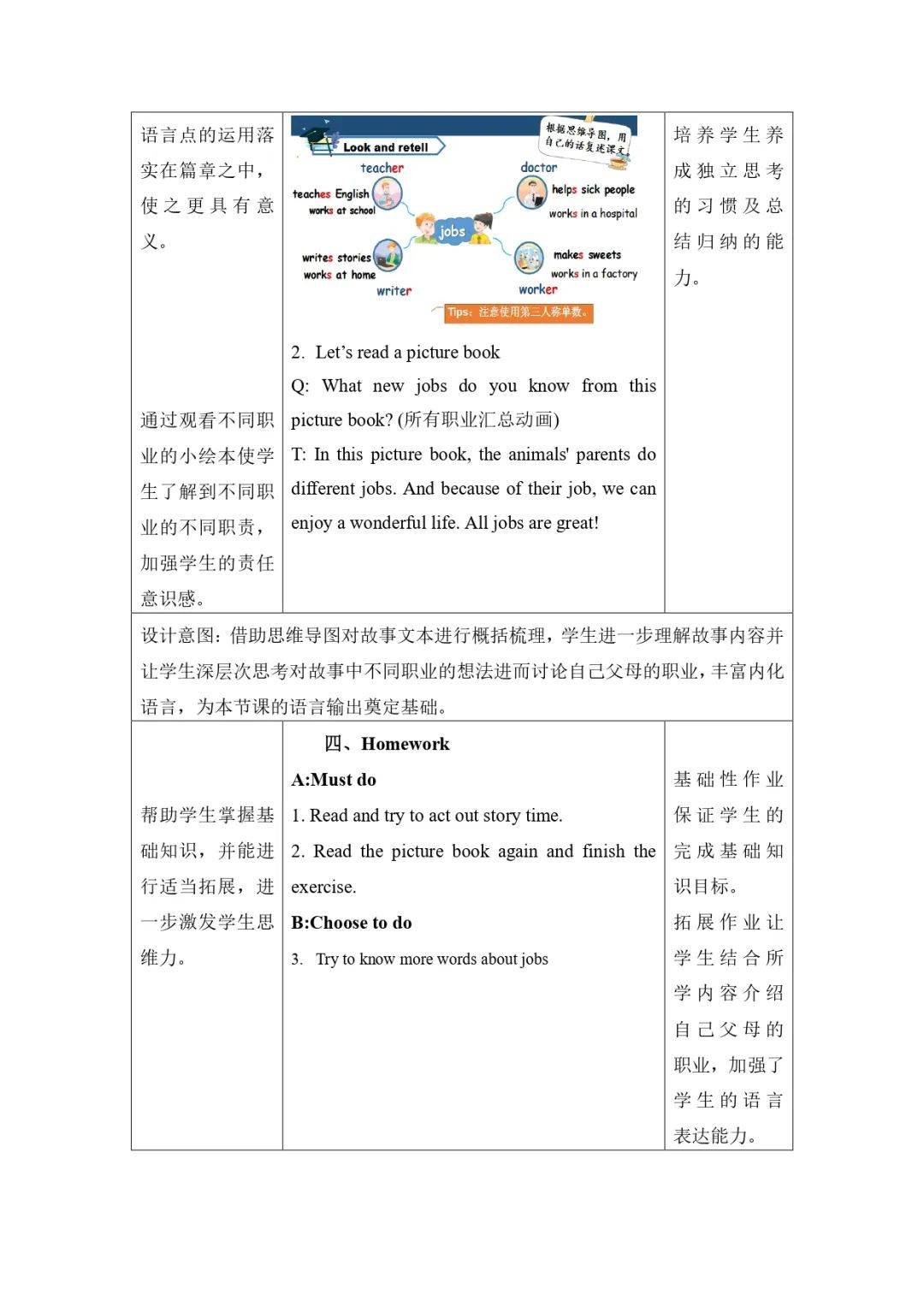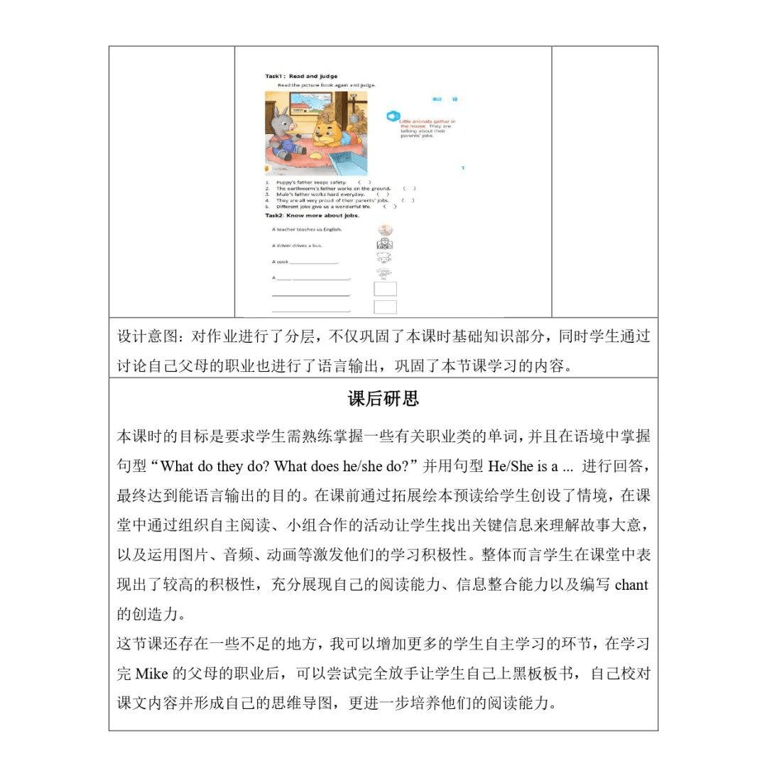 整堂课以job为主题,以探索同伴父母的职业为线索,学习了解不同职业的名称、工作内容和工作地点。本课时选择了《What does your father do?》作为融合绘本,由小动物的视角谈论它们父母的职业,绘本中大量重复了本课时的目标语言:“What does your father/mother do?”,“He/She is a….”让学生在感受有童趣的故事过程中,充分熟悉本课时的重要句型,为课堂中学生的自主学习探究作铺垫。