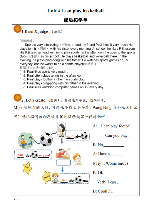 新课标提倡学生围绕真实情境参与到学习中去,引导学生在应用实践活动中内化所学语言知识,加深理解并应用。本单元的话题是I can play basketball,华老师师可以通过图片实物(物品),创设出一些语境,让学生体验语言的真实,自然及语言的交际功能。通过开展多模态的活动,让学生从多个维度谈论自己会与不会的运动;创设真实的情境,激发学生学习英语的热情。