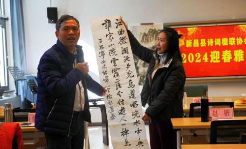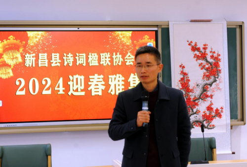新昌县诗词楹联协会徐金超会长就2023年工作所取得的成绩,一一向大家作了介绍。他从围绕中心工作,以诗词助力县域文化建设;开展诗教活动,提升诗词楹联创作水平、加强队伍建设,以诗联平台扩大协会的影响力等三个方面向与会嘉宾进行了展示。