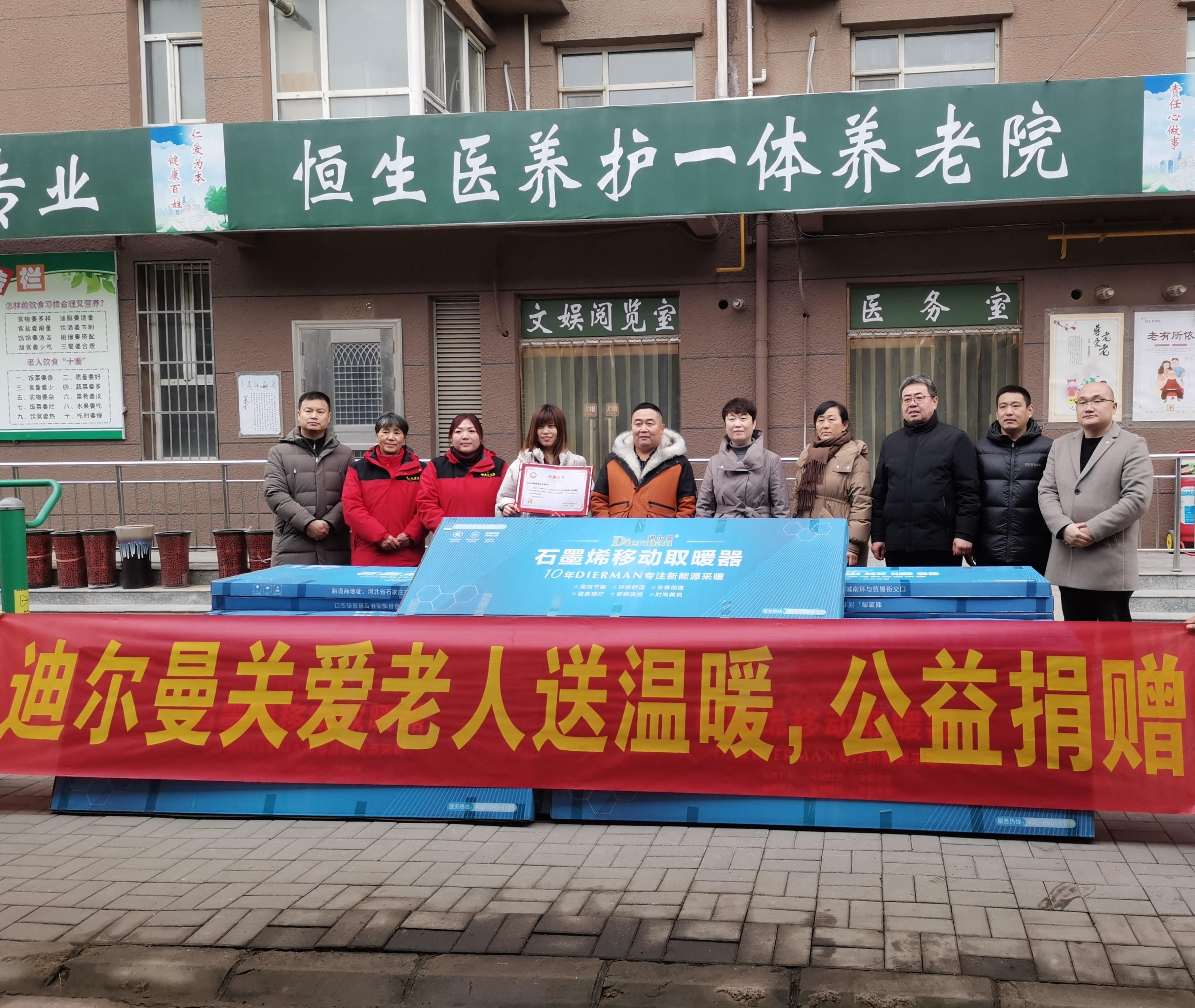 近日,河北迪尔曼科技有限公司通过河北省石家庄市栾城区民政局杜秀果局长向恒生养老院捐赠了石墨烯远红外取暖器。这一善举不仅体现了企业的高度社会责任感,更为养老院的老人送去了温暖和关爱。