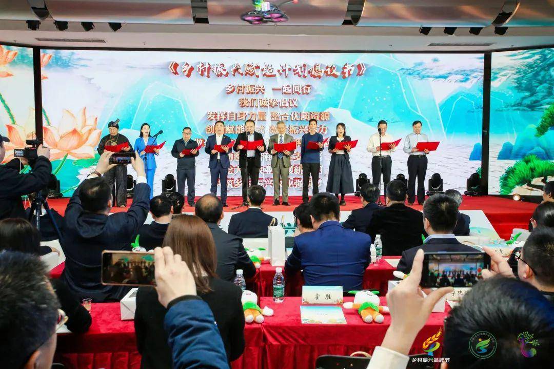乡村振兴品牌节厚植“三农”沃土,感召、带动社会各界力量共同投身乡村,助力振兴。中国农业电影电视中心党委委员、中心办(党办)主任张天佑,中国农业出版社原总编辑胡乐鸣,浙江大学哲学学院创新教育中心导师张为志,网库集团副总裁邱广志,北京星光美传文化传播有限公司董事长李志华,毕节市农业发展集团有限公司副总经理陈祖瑶,毕节盛丰集团董事长张浩,兰陵文旅集团副总孟宫羽,兰陵县融媒体中心(广播电视台)主任(台长)潘永共同上台,领倡宣读《乡村振兴赋能计划倡议书》。这些掷地有声的话语,激励大家继续勇毅前行,迎着时代浪潮,向着新征程踔厉奋进。