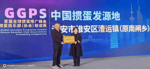 省人大原副主任丁解民为掼蛋发源地淮安市漕运镇(原南闸乡)的代表颁发“中国掼蛋发源地”匾牌