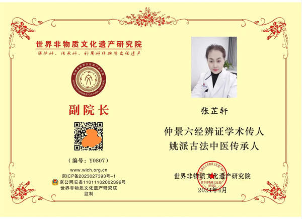 近日,笔者从世界非物质文化遗产研究院获悉,山东孔圣府国医馆专家组组长、华夏人文出版社签约国学研究学者、传统文化创新发展茅山论坛传统医学传播大使、张仲景六经辨证学术传人、当代伤寒大家姚秀玲先生的得意弟子张芷轩女士被世界非物质文化遗产研究院理事会聘为常务理事兼副院长。2024年3月张芷轩(曾用名张惠利)女士荣获中国管理科学研究院职业技术研究所颁发的健康管理师资格。