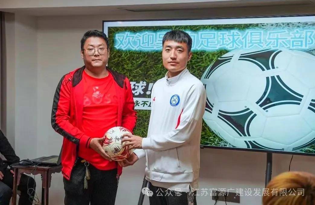 无锡吴钩足球 队长代表球队向富源广总经理虞涛 赠送全队签名足球 。
