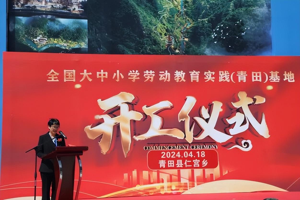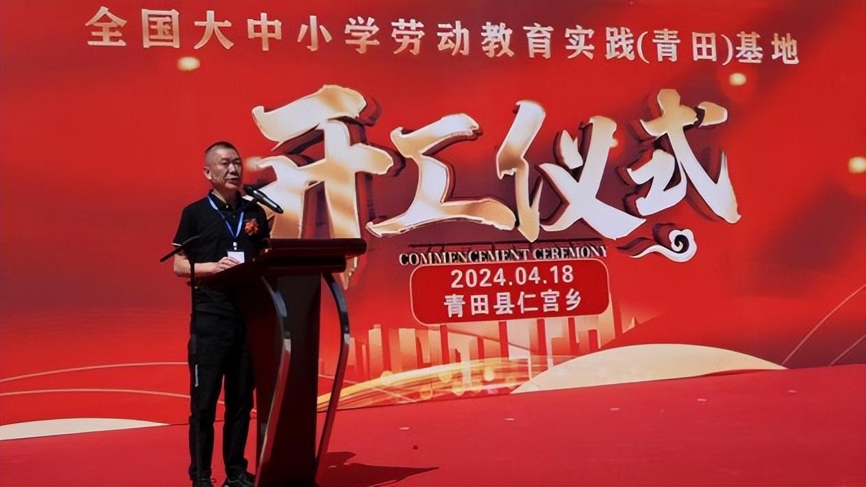 开工典礼上,青田县农业农村局副局长周王书代表青田县农业农村局致欢迎词,欢迎大家莅临石雕之乡浙江青田,参加大中小学劳动教育实践基地青田基地的开工典礼,青田地处深山,却面对大海,胸怀世界,青田艺人世代践行“匠心精神”,点石成金,彰显大国艺术风采,青田华侨投石问路,成为了“一带一路”的先行者。青田也是两山理论的积极践行者,青田的田鱼享誉世界。青田努力在稻鱼共生系统的精彩实践中争当农耕文明传承的引领者,践行“推动中华优秀传统文化创造性转化、创新性发展”,为全球重要农业文化遗产保护和利用提供青田模式。