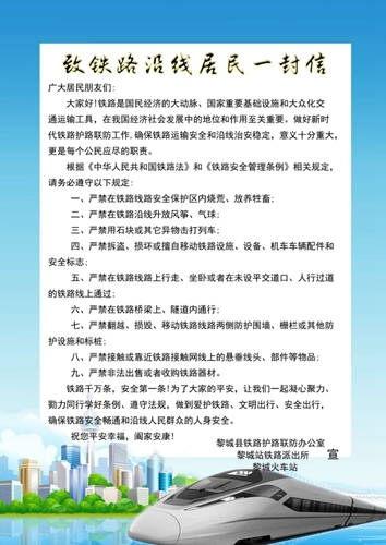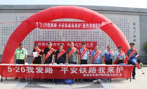 为进一步增强全民知路爱路护路意识,山西省长治市黎城县政法委积极筹划,早作准备,于5月24日上午组织黎城县住建和交通运输局、县教体局、县发改工信局、黎城站铁路派出所、黎城火车站、驻黎线务车间等15家县平安铁路建设成员单位,在该县城黎民广场举行“5·26我爱路 平安铁路我来护”宣传活动启动仪式,拉开了为期1个月的铁路爱路护路集中宣传月活动序幕。