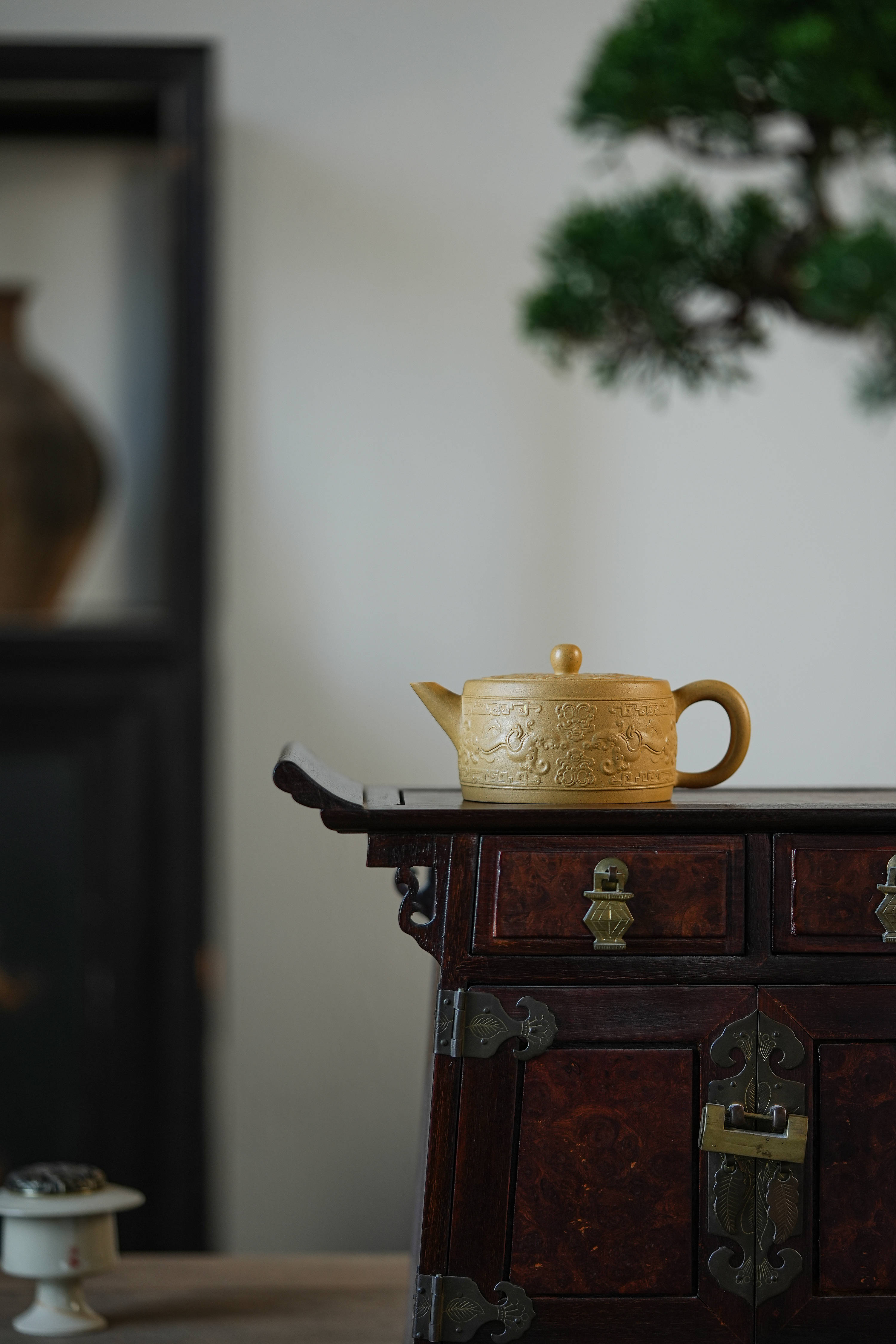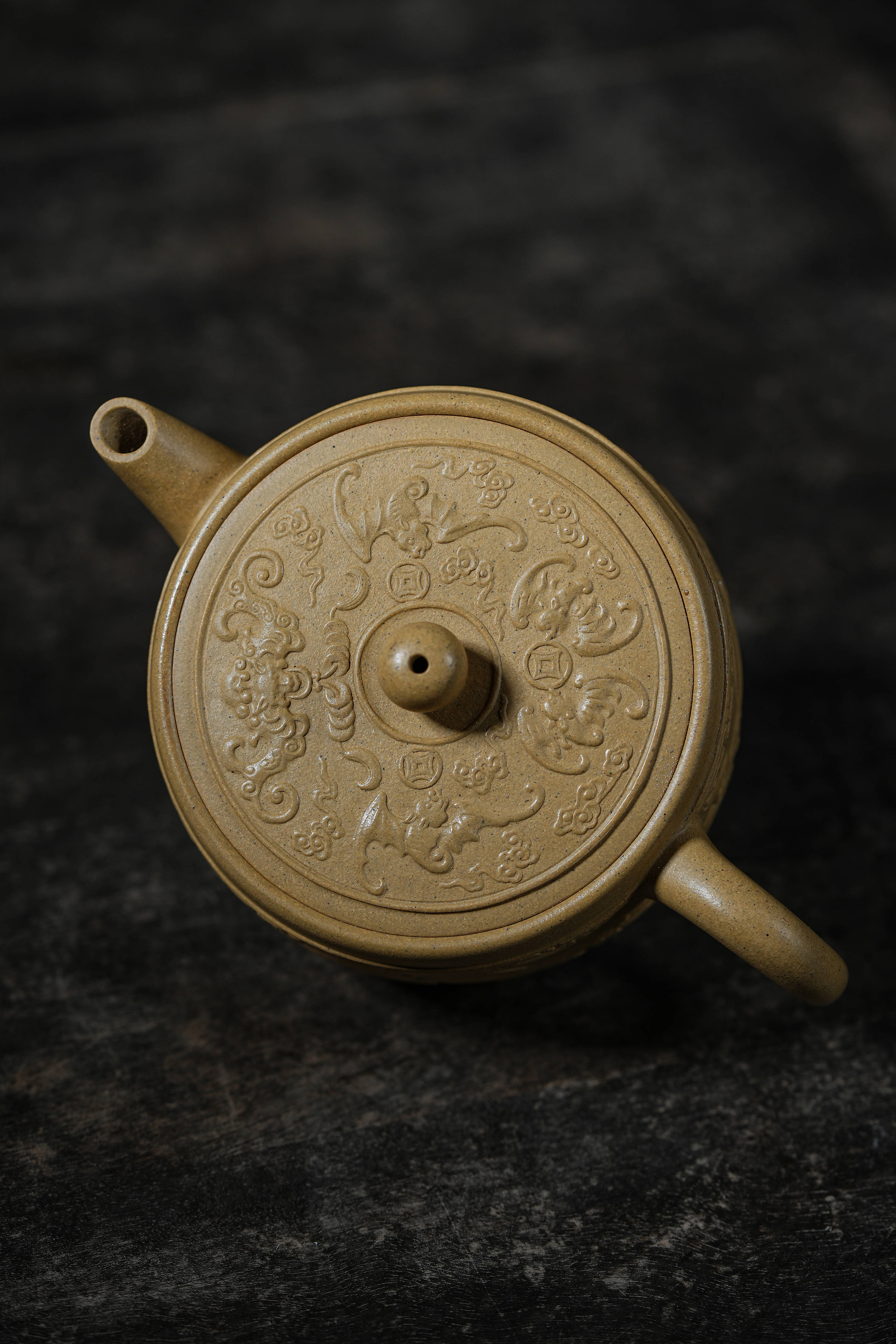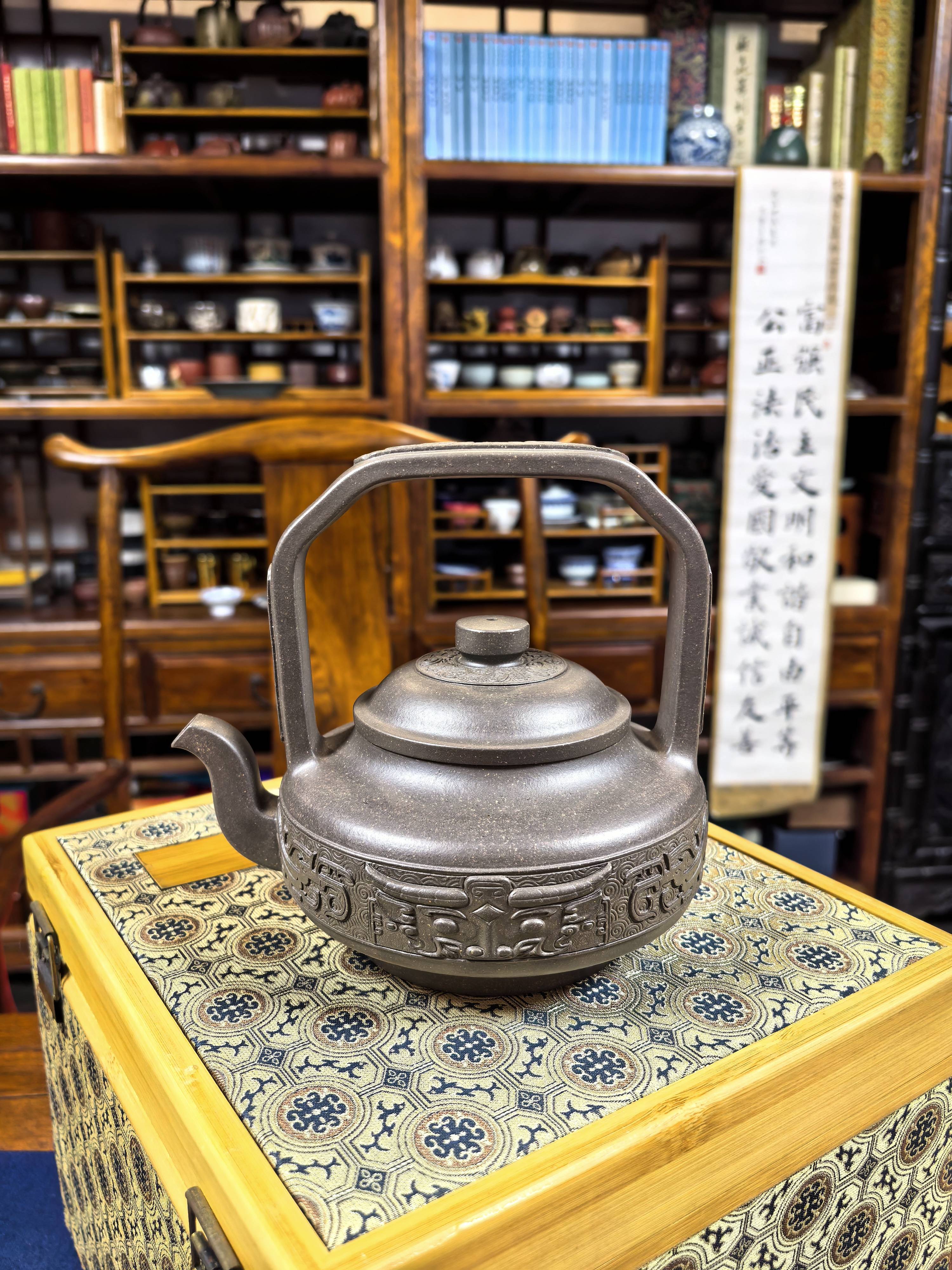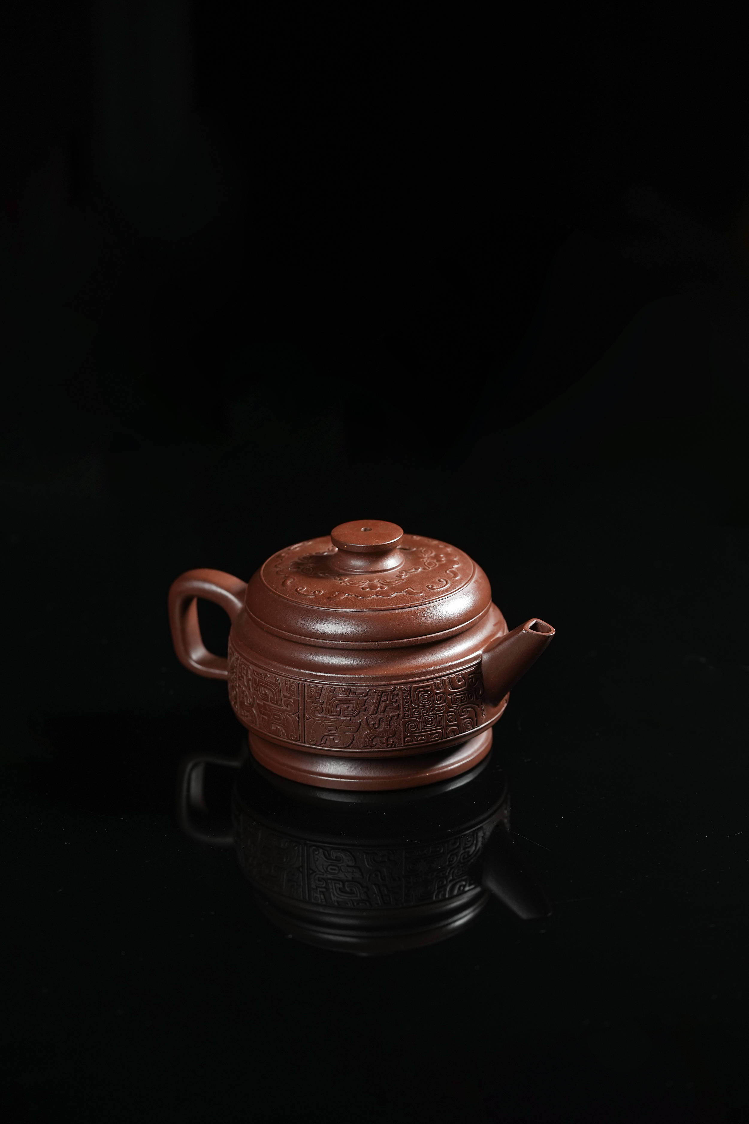 《吉金》汉代以前金往往指青铜,青铜器是中国古代最重要的艺术品之一,此作品即还原青铜器文化之精髓,吉金为礼器,用紫砂泥塑造其身形,并附以青铜器兽首纹,凤鸟纹等纹饰装饰,韵味十足,实为紫砂作品中的佼佼者。
