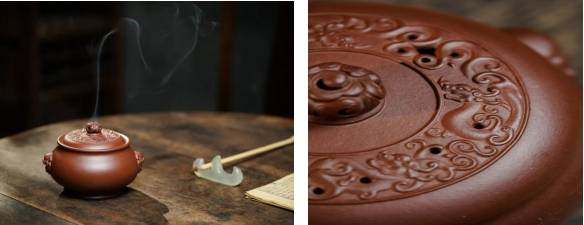 对于年青人,我们不但要听其言,更要观其行。以作品说话,用作品打动人,才是正道。他近期的新作《祥云镂空熏香炉》,我们从作品的设计理念即可见其用心良苦,非同一般。紫砂炉身搭配雕塑兽钮双耳镂空,其最为有新意的是炉盖粘贴彩塑祥云纹饰,并加以祥云炉钮,均以高难度的镂空形式表现,整体和谐,相得益彰,堪称一绝。试想,当文人墨客在幽静的书房里,点燃一柱名香,冉冉的烟雾从祥云中飘散而出,优美而灵动,如同一篇诗歌,缥缈间生发出令人陶醉的气味,是何等的文雅。