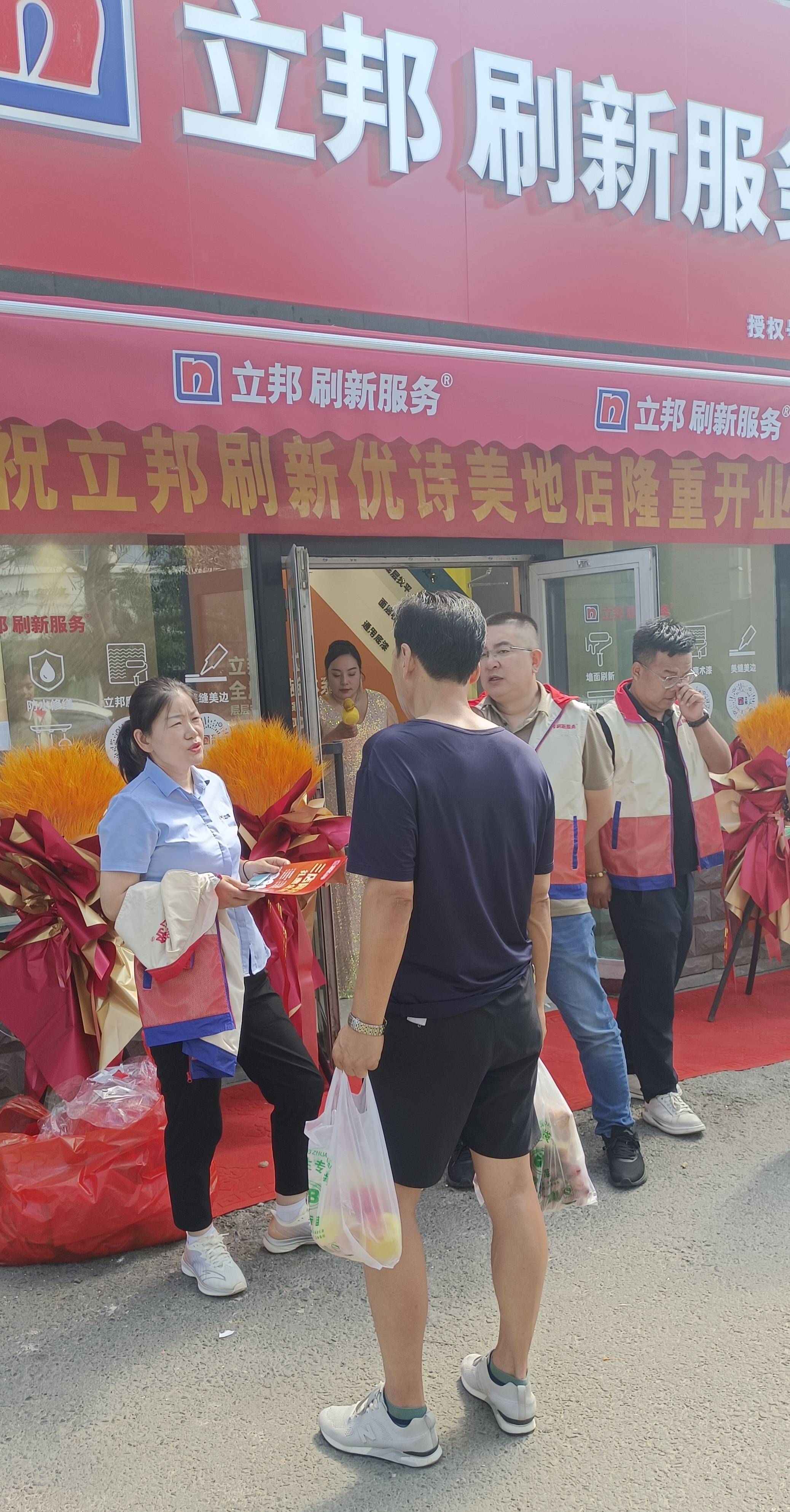 新开张的立邦刷新服务店的门口,摆放着高大崭新的花篮,开业大酬宾,店里的宣传品五颜六色,商品琳琅满目,还有很多优惠活动,一些人纷纷填写订单,询价声和欢笑声络绎不绝,热闹非凡!