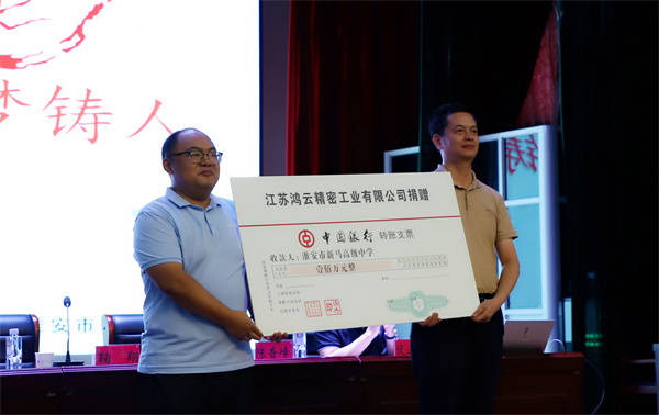 会上举行了捐赠仪式,新马高中陈香峰代表学校接受捐赠,并与江苏鸿云精密工业有限公司代表鞠翔厂长签署捐赠协议。