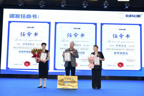 吴东潮先生对于伯科生活全球运营总裁孙艺芸女士,伯科生活商学院院长苏勇先生,伯科生活市场服务总裁陈宏盼女士颁发任命书。