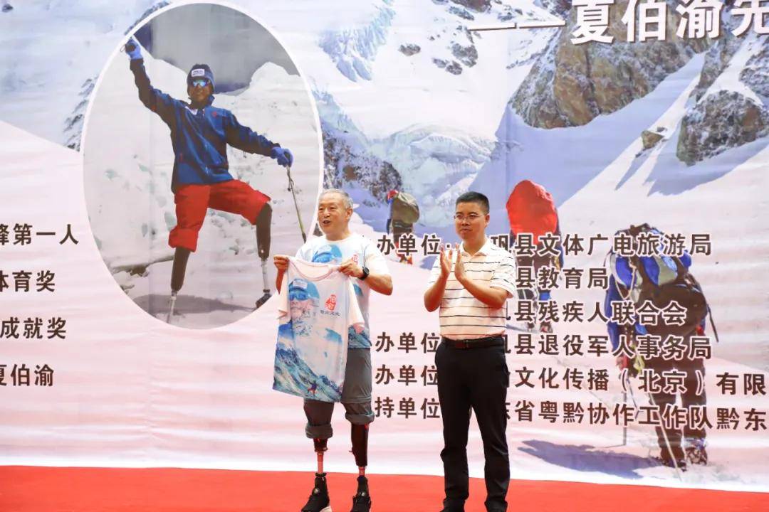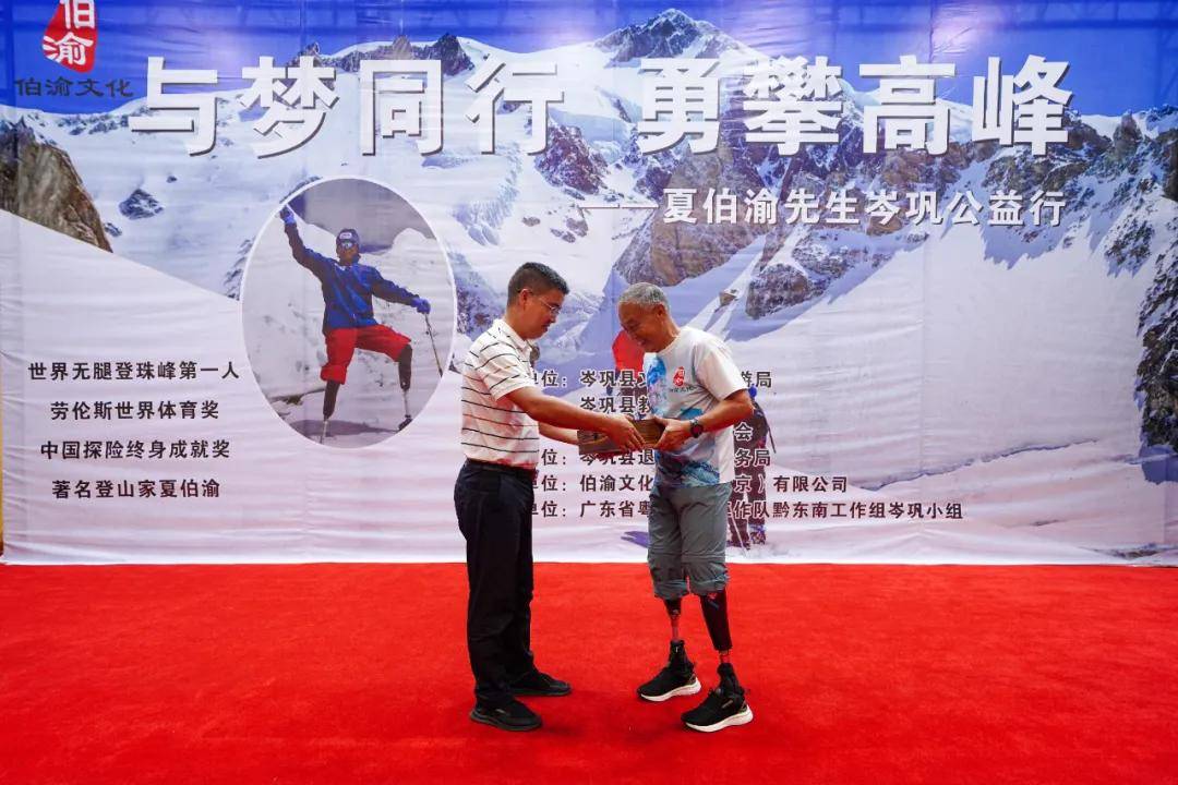 会上,县委常委、县委宣传部部长、县委统战部部长何洪道向夏伯渝先生赠送了思州石砚《珠峰神鹰》。夏伯渝先生回赠有中国珠峰足球队全体人员签名的伯渝文件T恤,并现场发放书籍《无尽攀登——无脚登山家夏伯渝的珠峰梦》。