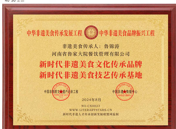 近日,笔者从相关部门获悉,豫东餐饮明星企业周口鲁家大院餐饮管理有限公司在中国非物质文化遗产记录工程和中国非遗大数据中心联合主办的非遗美食评选中荣获新时代非遗美食文化传承品牌和新时代非遗美食技艺传承基地的殊荣,周口鲁家大院负责人鲁锦涛先生也以深厚的传统餐饮文化底蕴,娴熟的非遗美食制作技艺被中华非遗美食品牌振兴工程聘为特邀研究员兼智库专家等殊荣。