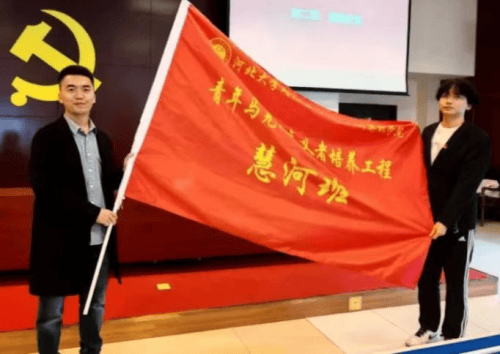 叶超飞老师向“青马工程·慧河班”授旗,慧河班学员代表余镇东同学接旗。