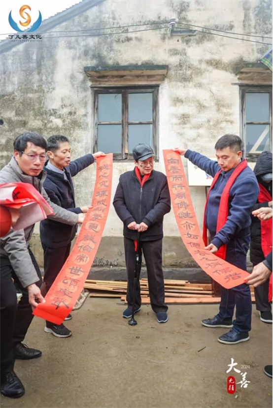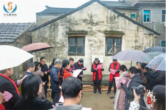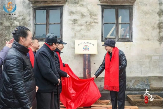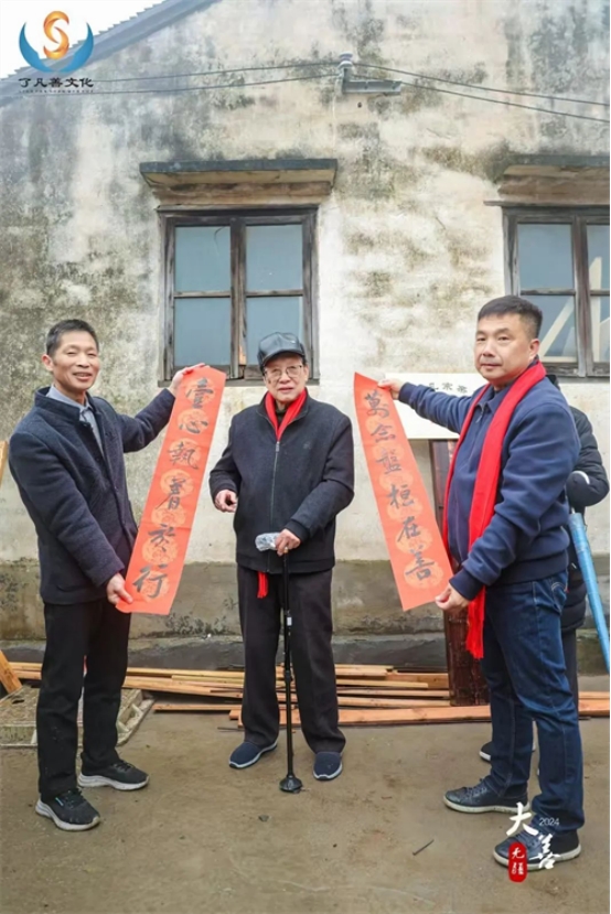 中华袁氏宗亲联谊会秘书长袁令文和赵田袁氏后裔一同为“袁了凡宗亲馆”揭牌。红绸缓缓落下,将活动推向高潮。分湖文史专家张舫澜先生和查文荣先生联手为宗亲馆撰写楹联:“万念盘桓在善,一心执着于行”“向善而行同佛性,亦如仙客,人称儒者;从心究理成新学,更启伦常,世颂家声”。两幅红色对联在阴雨绵绵中格外醒目,令人心生暖意。