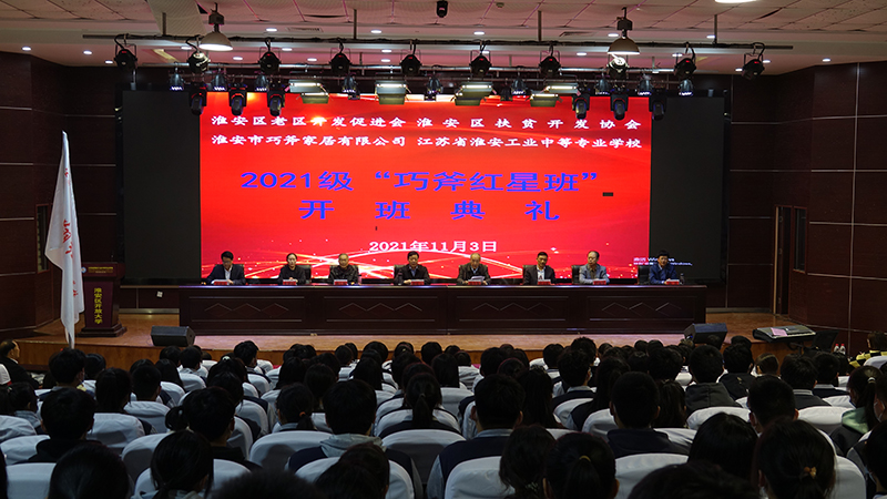 11月3日下午,江苏省淮安工业中等专业学校2021级“巧斧红星班”顺利开班。本届“巧斧红星班”由淮安区老区开发促进会、淮安区扶贫开发协会携手淮安巧斧家居有限公司冠名成立。淮安区老区开发促进会、淮安区扶贫协会会长殷长干,副会长徐学春、钟士和,区教体系统工会主席孙青等领导出席开班典礼。