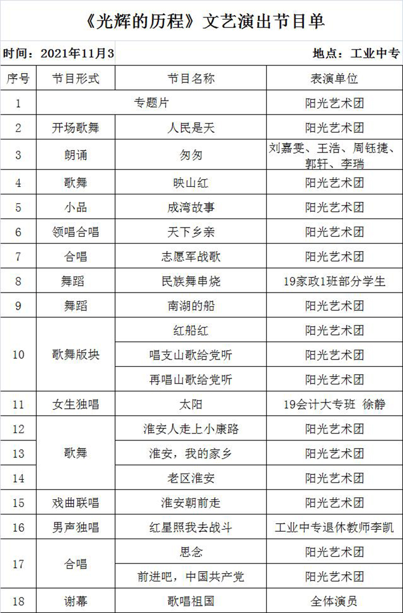 最后淮安区阳光艺术团的老艺术家们带来了精彩纷呈,形式多样的红色主题文艺节目,让同学们在节目中感受到老区精神的传承和发扬,引导学生感党恩、跟党走,树立正确的人生观、价值观,同时也更好地提高了学生的艺术视野和审美能力。