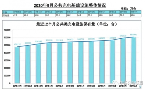 根据中国电动充电基础设施促进联盟发布的2020年9月充电桩运营数据,公共充电基础设施整体上维持增长,9月继续保持较快增长。具体来看,据数据显示,截至2020年9月,联盟内成员单位总计上报公共类充电桩60.6万台,其中交流充电桩35.0万台、直流充电桩25.5万台、交直流一体充电桩488台。从2019年10月到2020年9月,月均新增公共类充电桩约1.2万台。2020年9月比8月公共充电桩增加1.4万台,9月同比增长30.0%,随着电动汽车销量的持续向好,公共充电桩的新建数量也在逐渐增多。
