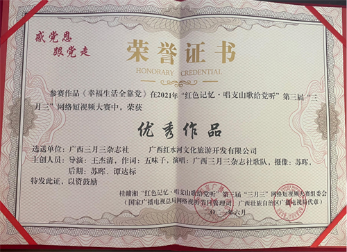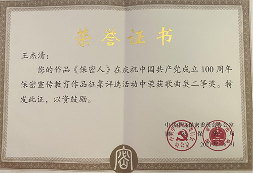 据了解,广西选送获奖歌曲《保密人》实为王杰清导演作词作曲,蒙丽妃演唱。王杰清是广西音乐家协会会员,对音乐有着专业的理解和鉴赏能力。同时,王杰清还是中国(广西)壮语春节联欢晚会和中国壮乡“三月三”校园民族文化节组委会主任、总导演;广西电视台《绿色广西》栏目总制片人。他除了以导演的身份参加“党旗飘扬、保密护航”主题评奖活动以外,近日,其作品《幸福生活全靠党》在“红色记忆·唱支山歌给党听”第三届“三月三”网络短视频大赛中脱颖而出,被评为优秀作品。该大赛由国家广播电视总局网络视听节目管理司指导,广西壮族自治区广播电视局、湖南省广播电视局、江西省广播电视局等单位联合举办。多年的中国(广西)壮语春节联欢晚会和中国壮乡“三月三”校园民族文化节的导演经验让他对民族文化有着深层和独特的理解,他用“民族的,才是最具魅力的”的理念创作出《幸福生活全靠党》和《保密人》等富有民族文化和家国情怀作品。这些作品弘扬党为人民美好幸福生活不忘初心、砥砺前行和人民群众爱党赤诚的精神风貌,作品主题鲜明,积极向上,读之有味,品之芳香。