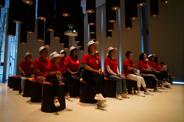 推开白桦林中的一扇门便是森林放映厅,教师们坐在“树桩椅”上观看着农夫山泉的介绍宣传片,仿佛身处大自然跟随短片的内容一步一步了解着农夫山泉。