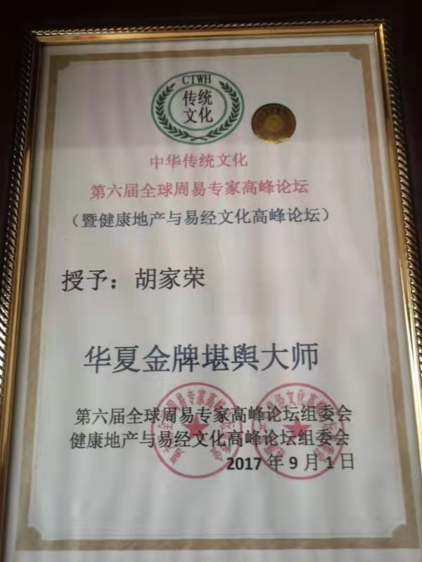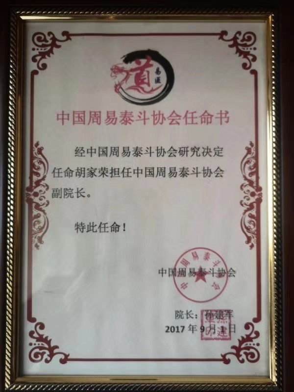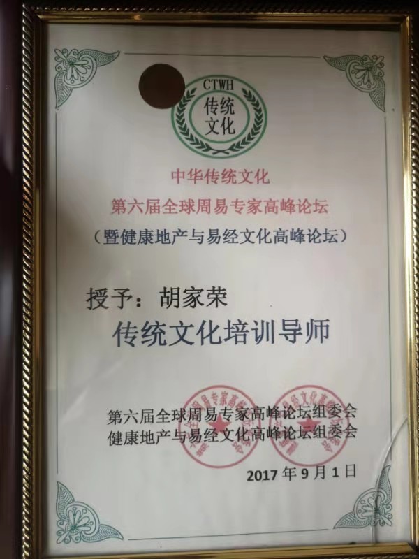 胡家荣,中国著名国学风水大师,央视国学频道易经文化领航人物,中央电视台星光影视基地智慧中国栏目荣获"中国当代杰出风水策划师",中央电视台决策中国专家智库联盟副理长,温州天旗国学文化传媒有限公司董事长,武汉天旗国学文化传媒分公司董事长,海南一路同程旅业发展公司总监,海南华嘉贸易公司总经理,吉林省鹿盛商贸(酒业)公司股东,胡家荣,原名:胡家勇,四川成都人,中国龙虎山天师府道长,中国名人百科行业影响力人物,中国周易泰斗协会副院长、华夏金牌堪舆大师、中华传统文化培训导师。他曾被全国促进传统文化发展工程工作委员会授予《华夏英杰》称号,浙江(温州)姓氏文化研究中心理事单位、湖北贵昌无纺布设备科技有限公司、浙江九宫装饰工程、浙江安宝乐止滑鞋,湖南沅陵丽荣华府酒店,温州鑫业影视文化公司、东阳诚乾影视公司,四川商会等特聘为专业风水顾问。