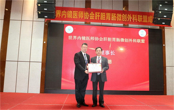 感谢钟南山院士,对本次大会的热情指导和关怀,并特别委托国家卫建委有突出贡献专家、世界内镜医师协会泌尿外科联盟副理事长、广州第一医院钟惟德主任到大会代表钟南山院士致贺支持,并带来钟院士亲笔题名的贺词:“世界内镜,沟通中西,造福人民!”并代表协会授予世界内镜医师协会肝胆胃肠联盟理事长贺德教授聘书。