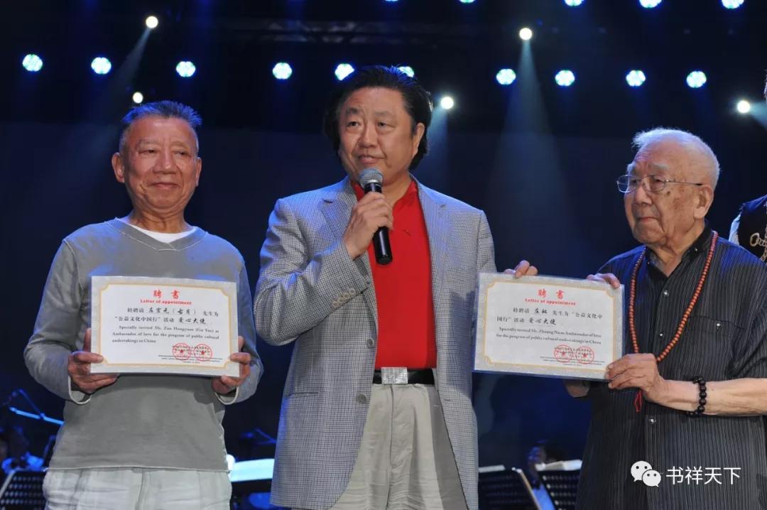 于连胜代表公益文化中国行组委会向庄奴(著名词作家)和古月(著名作曲家)颁发“公益文化中国行-爱心大使”聘书
