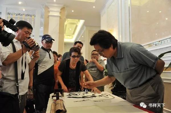 庄奴(中)在于连胜书《庄奴歌词书法长卷》展示现场登台发表感言