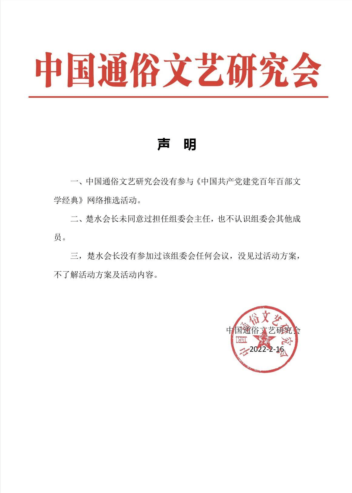 一、中国通俗文艺研究会没有参与《中国共产党建党百年百部文学经典》网络推选活动。
