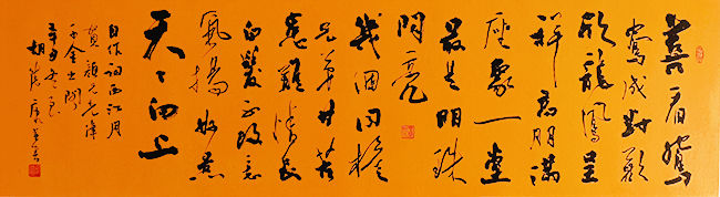 释文:喜看鸳鸯成对,欢欣龙凤呈祥。高朋满座聚一堂,最是明珠闪亮。几个同檐兄弟,甘苦患难情长。白发不改意气扬,好景天天向上!
