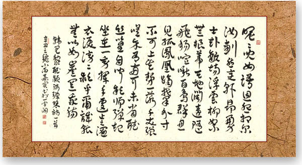 嘉宝女士最喜欢的是创作的这幅岳飞的《满江红》,所以,挂在展览的第一幅。这幅作品一气呵成,有驾长车踏破贺兰山处之气概,也有雄襟万里的回肠。客观地说,文静靓丽的嘉宝女士,不像战争年代作家丁玲女士,乃是昨日的文小姐, 今日武将军,纤笔一枝谁与似? 三千毛瑟精兵,却写出了怒发冲冠,万丈豪气,足见嘉宝女史之境界,完全可以神接古人,气接天宇。