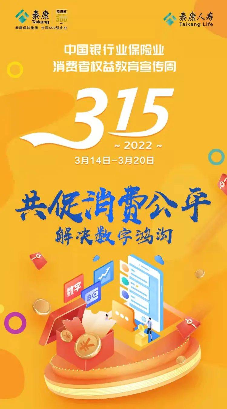 2022年,泰康人寿坚持围绕保护客户权益,响应监管要求,以“共促消费公平·共享数字金融”为核心主题,开展了2022年“3.15”消费者权益保护教育宣传周系列活动。