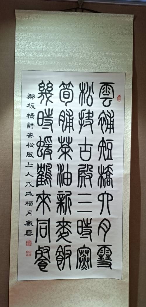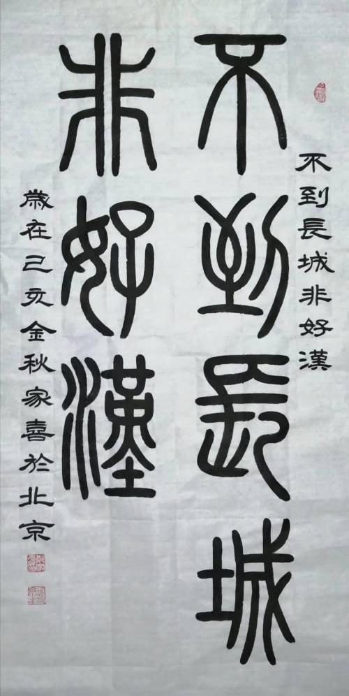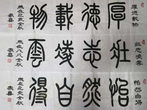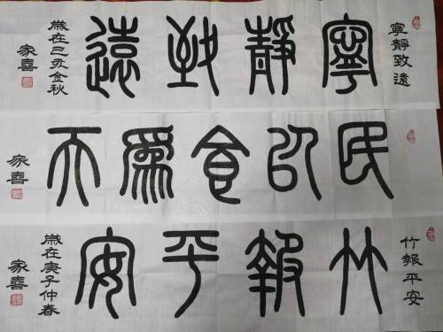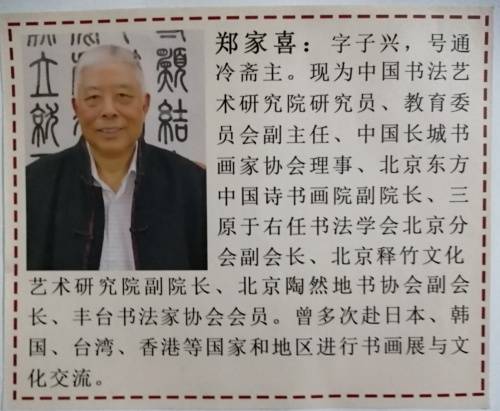 郑家喜先生(北京人),与共和国同龄人;十岁师从于高维彦先生,学习书法绘画;几十年笔耕不缀。 八十年代进一步学习艺术画像,写意花鸟;2000年起潜心研究古文字。临习峄山刻石、会䅲刻石、甲骨文、毛公鼎、石鼓文,李阳冰的城隍庙记,特别情终于吴让之的无均贴;临习百遍以求真趣。逐步形成自己的独特风格,多次参加大展并获“德艺双馨”艺术家称号; 书法作品已被戒台寺、灵隐寺、大观园等单位收藏。