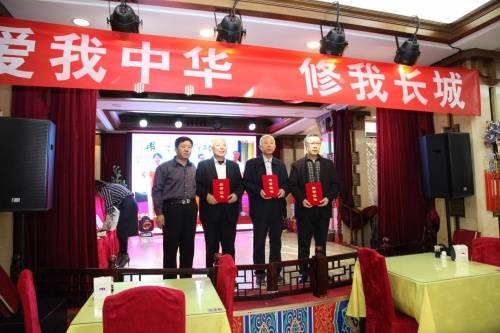 (郑家喜先生【左二】应中国长城文化志愿者宣讲团发起人朱长云先生【左一】之邀出席“爱我中华 修我长城”题词发表35周年活动,并为本次活动书写“长城精神永驻我心”书法作品;并与著名书画家王玉峰先生【右一】和著名书法家宁天元先生【右二】一起合影留念)