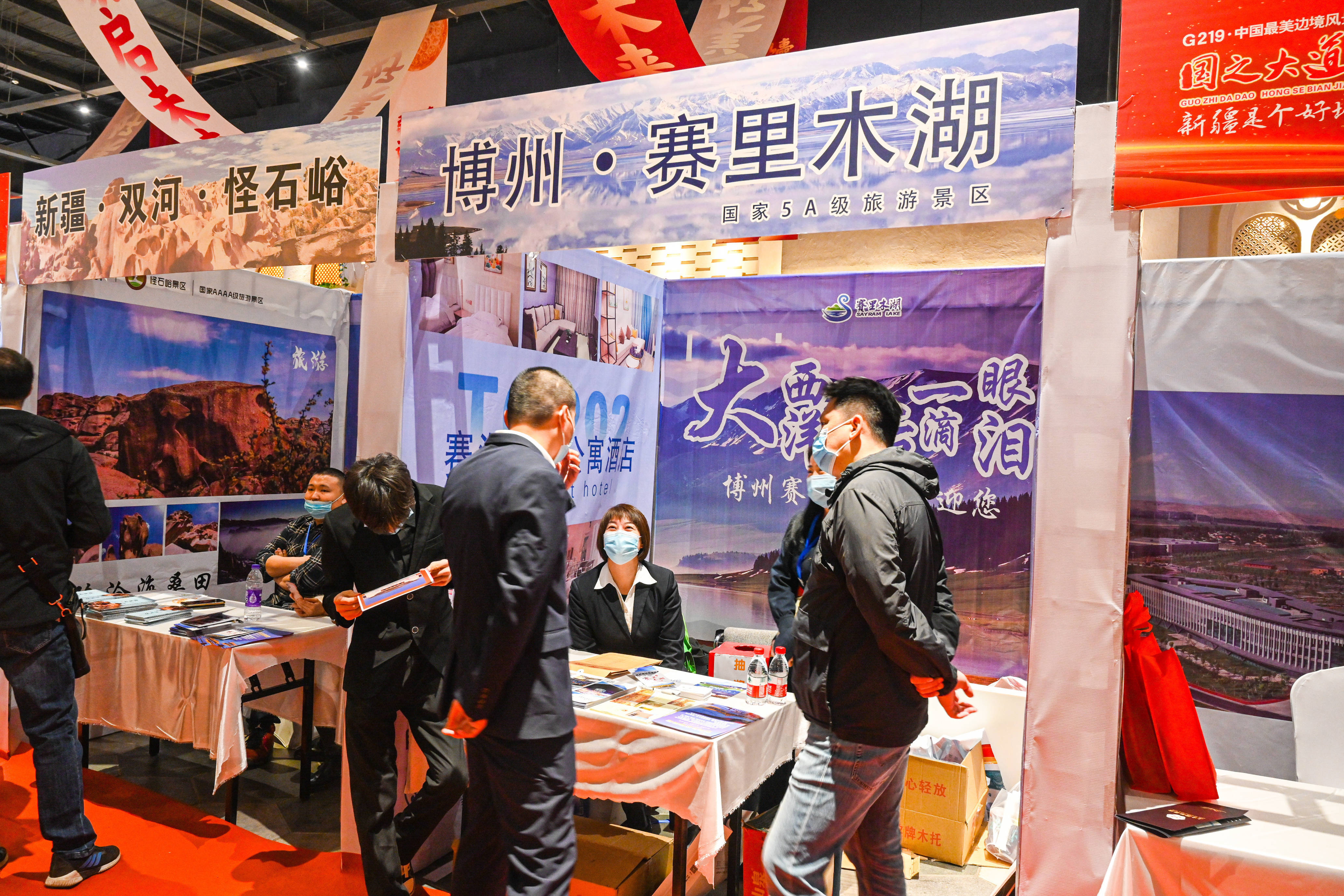 现场,数十个展位前热闹非凡,各景区、酒店、旅行社在推介着各自最新产品,游人们纷纷索要资料,了解最新的旅游线路、景区政策和住宿条件,筹划着今年的旅游目的地,同时,还购买到全疆各地名优特产。