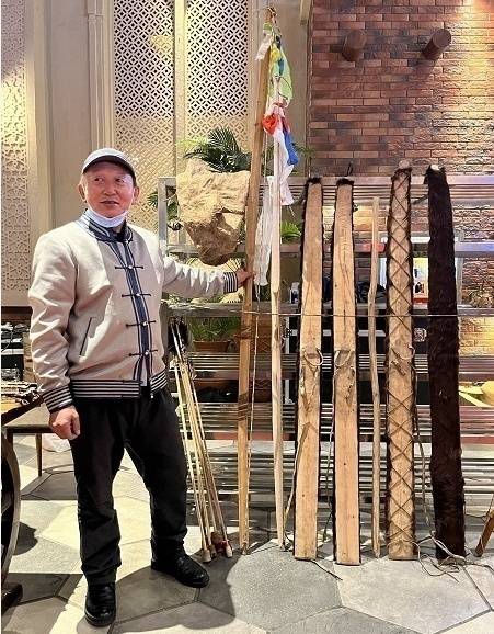 ▲为北京冬奥会赠送自己精心制作的古老毛皮滑雪板的阿勒泰市汗德尕特蒙古乡汗德尕特村民间艺人帖木尔加甫特邀参会。 同古龙摄