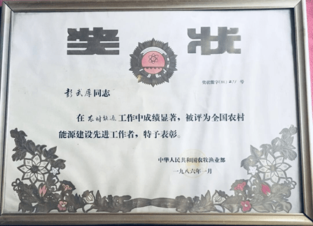 该工程峻工时,授予彭武厚壹等奨、陸鑫.二等奖,还有三位三等奨。在上述工程后,在宁波市的梅湖农场、镇海骆驼镇又相继建起了二座沼气工程.分获浙江省“先进工程壹等奖“与“工程效益奨”。