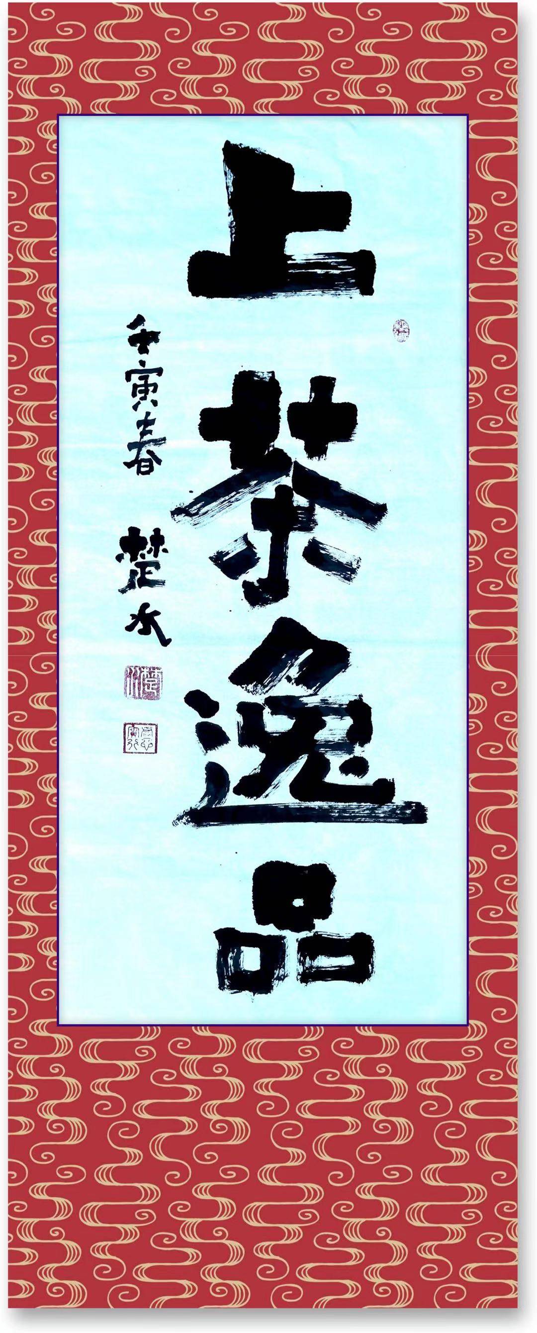 而此时之蓝兄章财正在武夷山上采茶,茶绿谷深,沁人心脾,让人陶醉,于是乎爨字再写上茶逸品,就颇有些许感觉,特别是这个“上”多有武夷山巉岩绝壁之巍峨,有神来之笔之态,让人心仪,大有精神。茶煮乾坤醉,品茶就品上茶逸品,难道不是?肯定不输于虎跑泉之龙井茶,不信品茗而醉之,自会认为楚某从不虚言。
