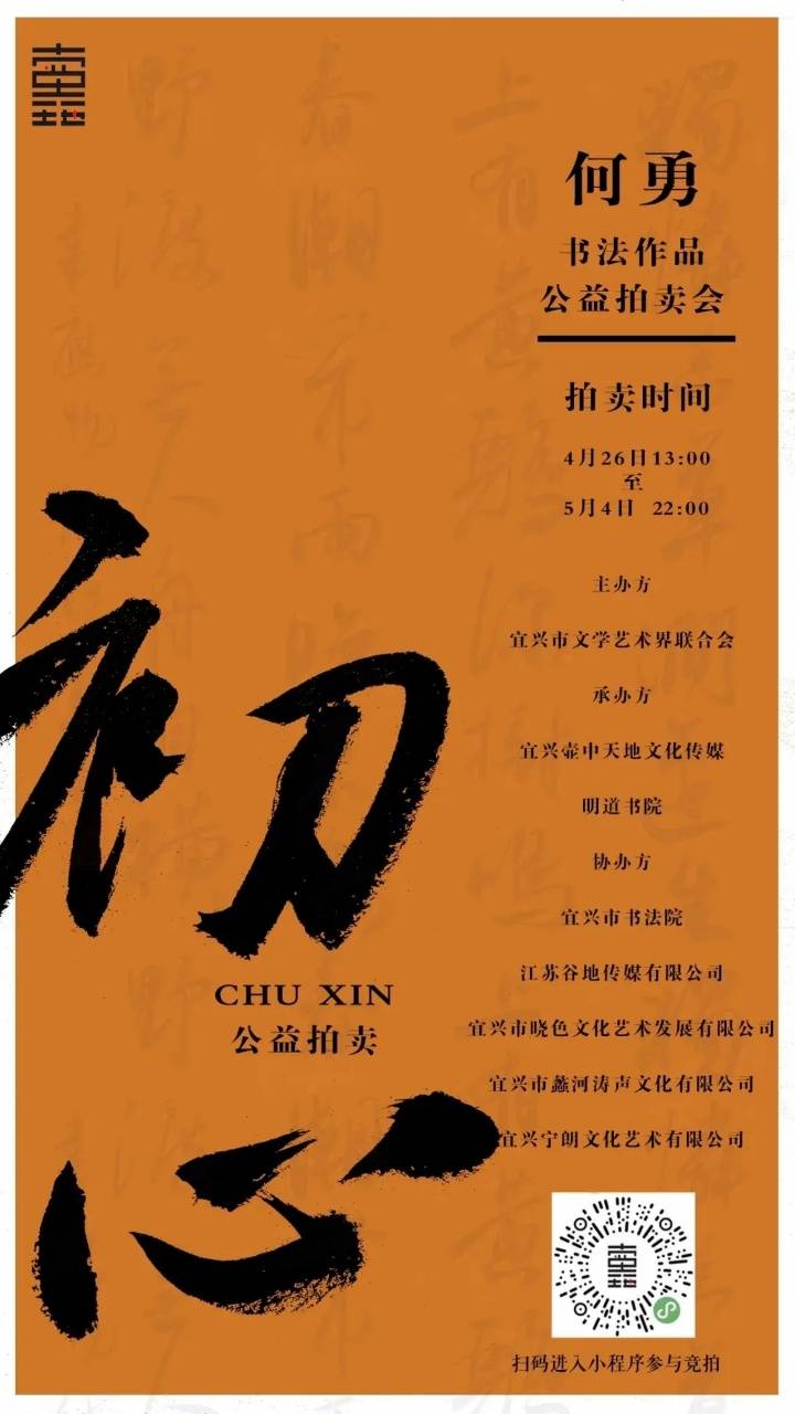 据悉,此次拍卖会由宜兴市文学艺术界联合会主办,宜兴市壶中天地文化传媒、明道书院承办,宜兴市书法院、江苏谷地传媒有限公司、宜兴市晓色文化艺术发展有限公司、宜兴市蠡河涛声文化有限公司、宜兴市宁朗文化艺术有限公司协办。